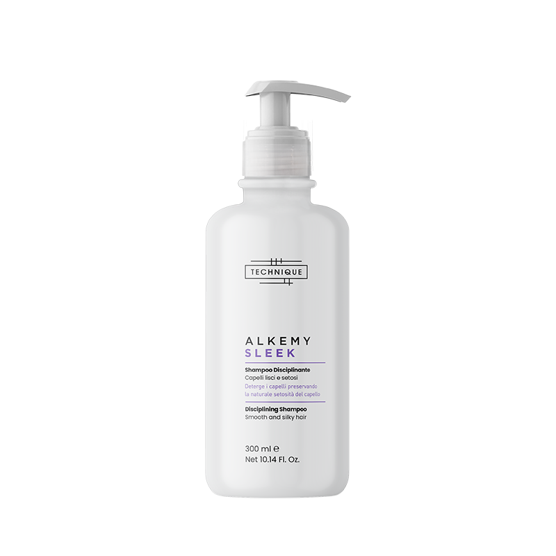 Alkemy Sleek, Champô alisador anticrespo, enriquecido com extrato de algodão, garante um efeito brilhante e controla o efeito crespo dos cabelos rebeldes. Lava delicadamente e suaviza o couro cabeludo. Cheiro agradável de fruta.